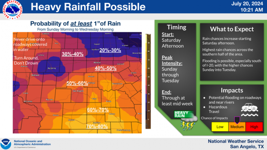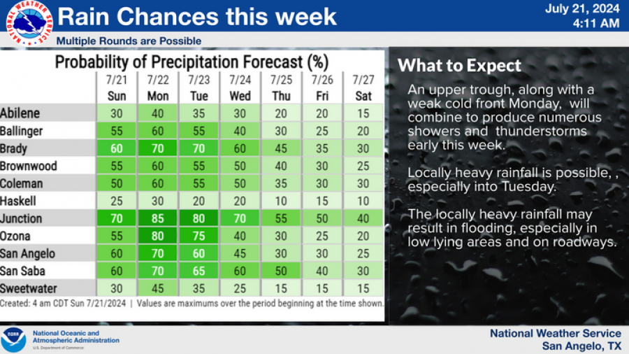 The National Weather Service also released a detailed forecast of precipitation probabilities for the week. Cities such as Brady, Junction, and Ozona have a 70% to 80% chance of rain from Monday to Tuesday, with lesser chances later in the week. San Angelo has a 70% chance of rain on Monday and 60% on Tuesday, decreasing to 45% on Wednesday and 30% on Thursday.