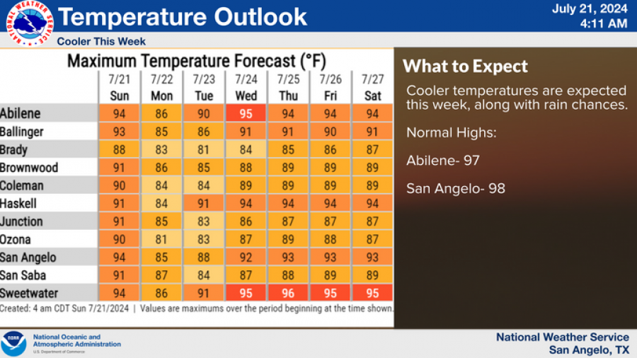 Temperatures are expected to be cooler this week, with highs in the mid to upper 80s to lower 90s, below the normal highs of 97°F for Abilene and 98°F for San Angelo.