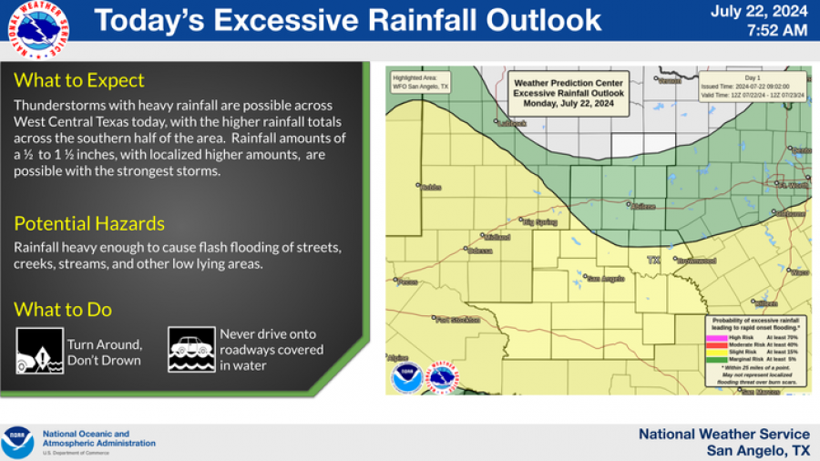 SAN ANGELO, TX – The National Weather Service has released an excessive rainfall outlook for West Central Texas today, with thunderstorms expected to bring significant rainfall, particularly in the southern part of the region.