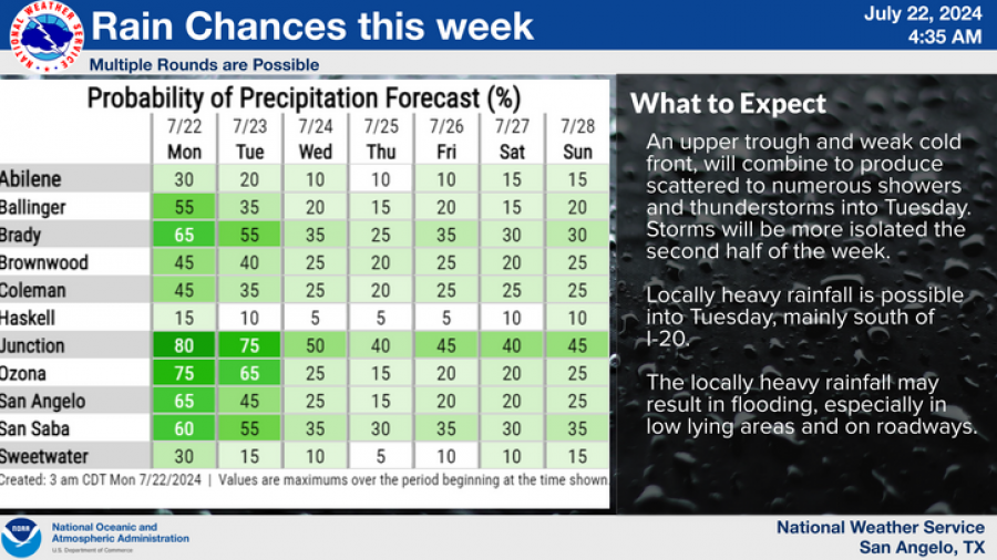 The probability of precipitation varies across the region this week. Today, San Angelo has a 65% chance of rain, while Junction and Ozona face a 75% likelihood. Rain chances decrease as the week progresses, with isolated showers and thunderstorms expected mainly south of I-20.