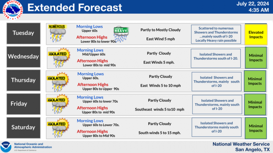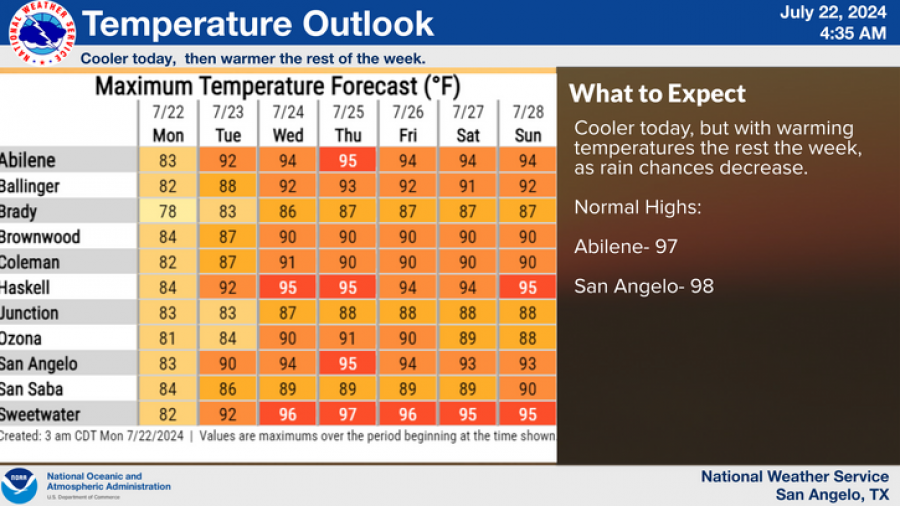 Temperatures will be cooler today but are expected to rise throughout the week. San Angelo’s highs will range from 90°F today to 95°F by Thursday. The region will see warmer temperatures and reduced rain chances later in the week.