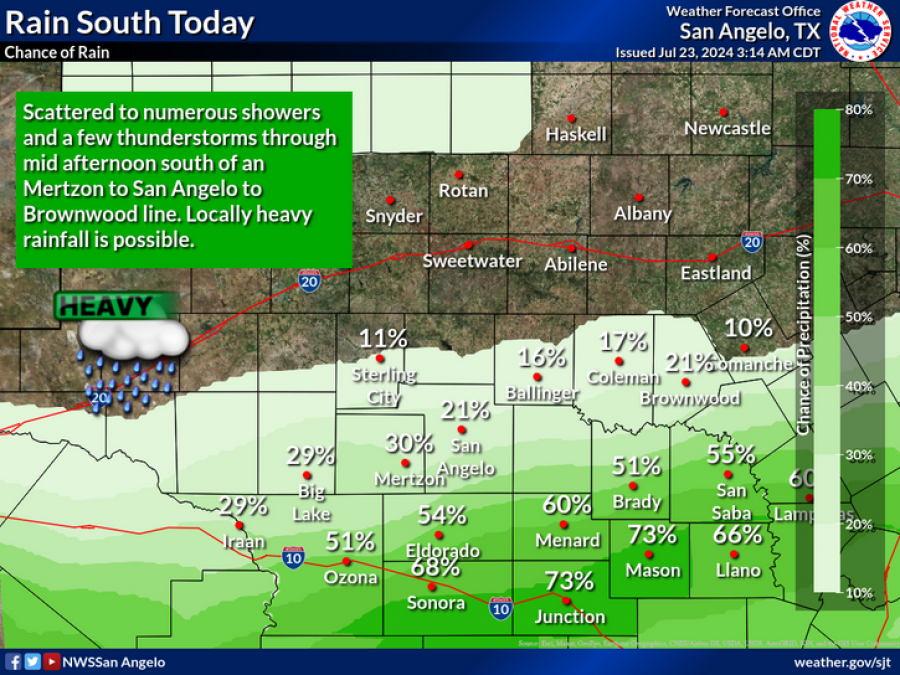 Rain chances vary across the region, with Junction and Mason facing the highest probability of precipitation at 73%. San Angelo has a 21% chance, while areas like Sonora and Eldorado can expect rain probabilities of 68% and 54%. The forecast also indicates a potential for locally heavy rainfall, increasing the risk of flash flooding in streets, creeks, and other low-lying areas.