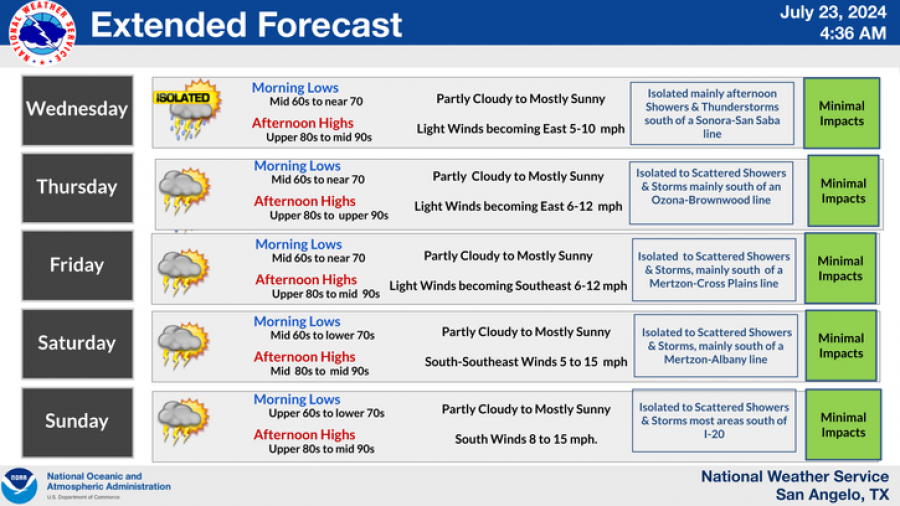 - Thursday: Morning lows in the mid-60s to near 70; afternoon highs in the upper 80s to near 90s. Isolated to scattered afternoon showers and storms mainly south of the Ozona-Brownwood line.