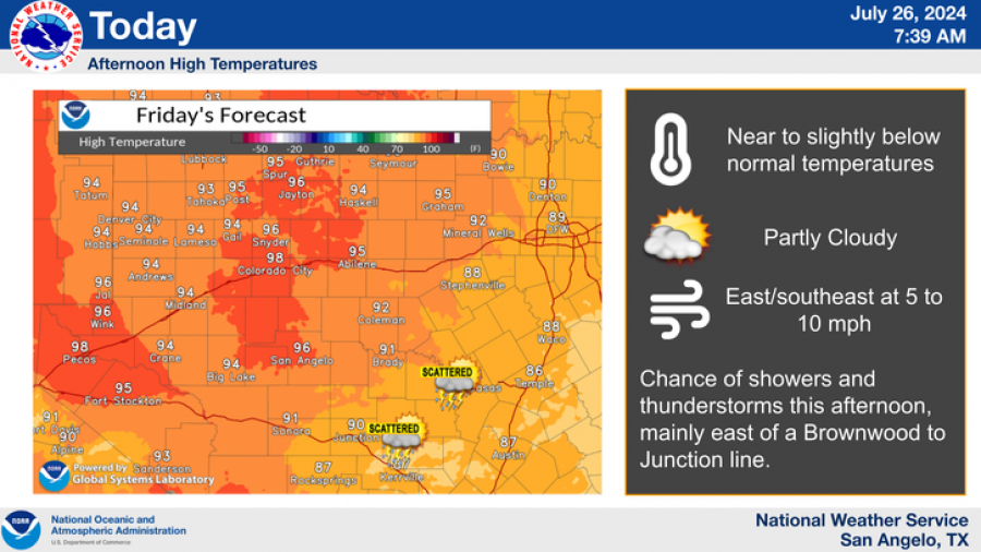 SAN ANGELO, TX – The National Weather Service forecasts near to slightly below normal temperatures for San Angelo today, with highs expected to reach 96 degrees.