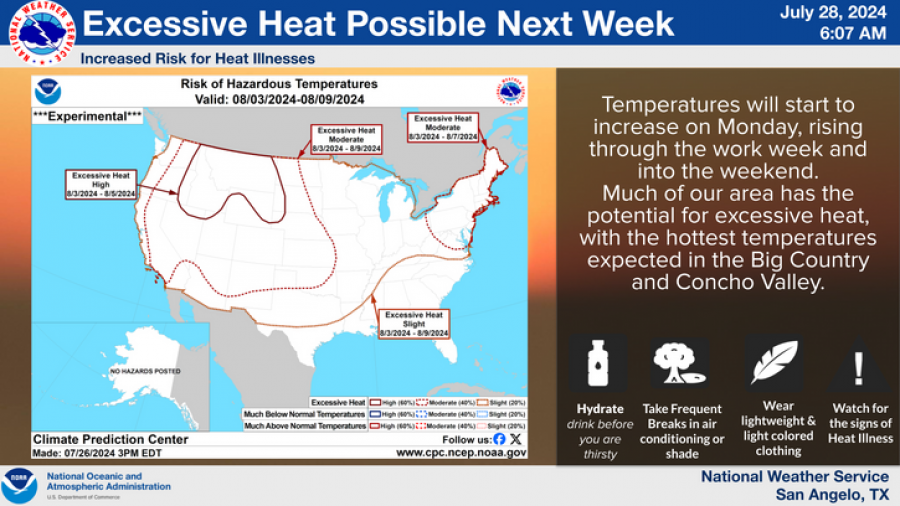 Temperatures will start to increase on Monday, rising through the week and into the weekend. The region faces the potential for excessive heat, with the hottest temperatures expected in the Big Country and Concho Valley.