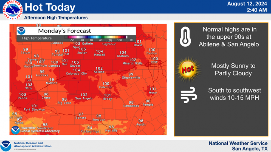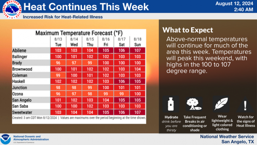 SAN ANGELO, TX — The National Weather Service has released a forecast for San Angelo and surrounding areas and it shows another week of sweltering temperatures.