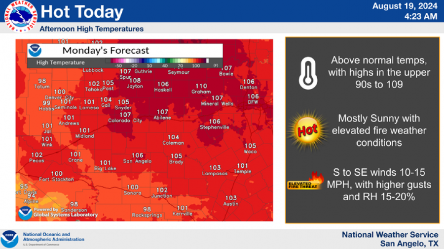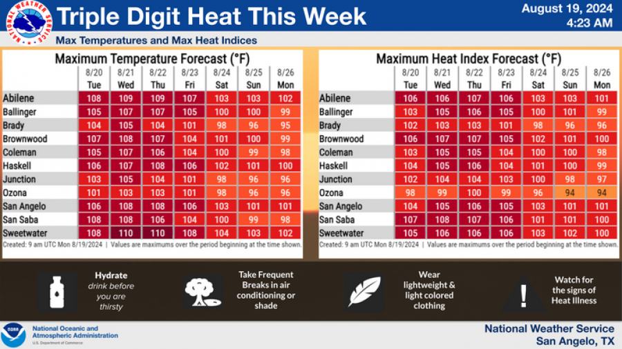 SAN ANGELO, TX – The National Weather Service in San Angelo has issued a heat advisory for today from 1 p.m. to 9 p.m., with temperatures expected to soar between 105 to 109 degrees across the Big Country, Concho Valley, and Heartland regions.