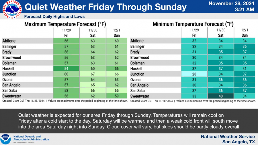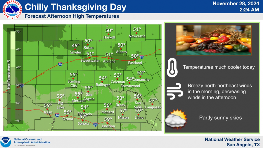 Thanksgiving Day is shaping up to be much cooler, with afternoon highs in San Angelo and surrounding areas expected to range from 50 to 57 degrees. Breezy north-northeast winds will ease by the afternoon, and partly sunny skies will dominate the day.
