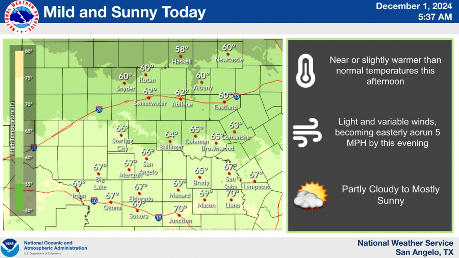 Temperatures will remain mild throughout the week, with highs in San Angelo peaking in the mid-to-upper 60s and lows in the upper 30s to low 40s.
