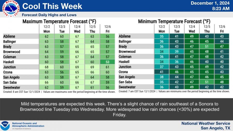 Looking ahead, an approaching disturbance on Friday may bring a 30% chance of rain, particularly southeast of the Sonora-to-Brownwood line. Cooler temperatures are expected to follow.
