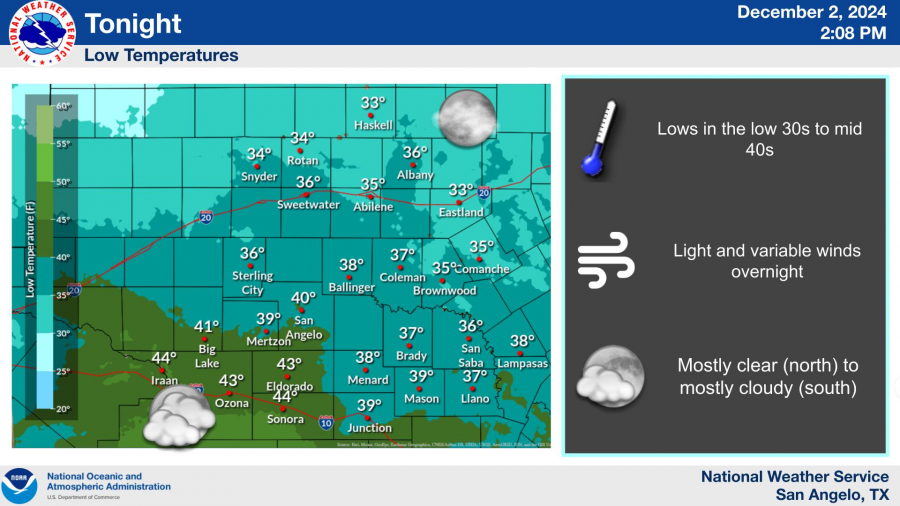 Elsewhere across the region, temperatures will drop into the lower 30s overnight for parts of the northern Big Country, with areas further south, such as Big Lake and Ozona, expecting slightly warmer conditions. Light and variable winds, coupled with partly cloudy skies, will set the tone for the night.