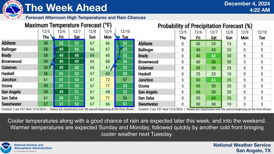 SAN ANGELO, TX — Above-normal temperatures are forecast for the San Angelo region Wednesday, with highs reaching the low 70s. However, changes are on the horizon as a chance of showers and thunderstorms, along with cooler weather, is expected later this week.