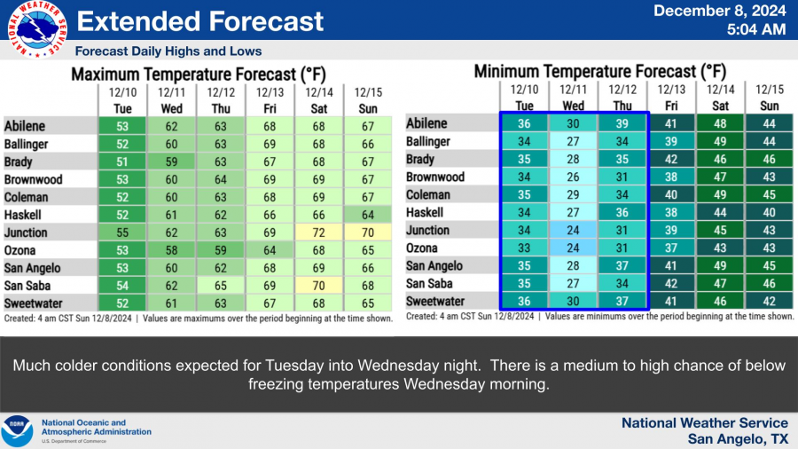However, colder conditions will follow as a cold front arrives Monday night, bringing much cooler air by Tuesday. Overnight lows Tuesday into Wednesday will dip into the 20s and 30s across the region, with freezing temperatures likely in many areas Wednesday morning. Forecasted lows include 28 degrees in San Angelo, 27 in Ballinger, and 26 in Brownwood.