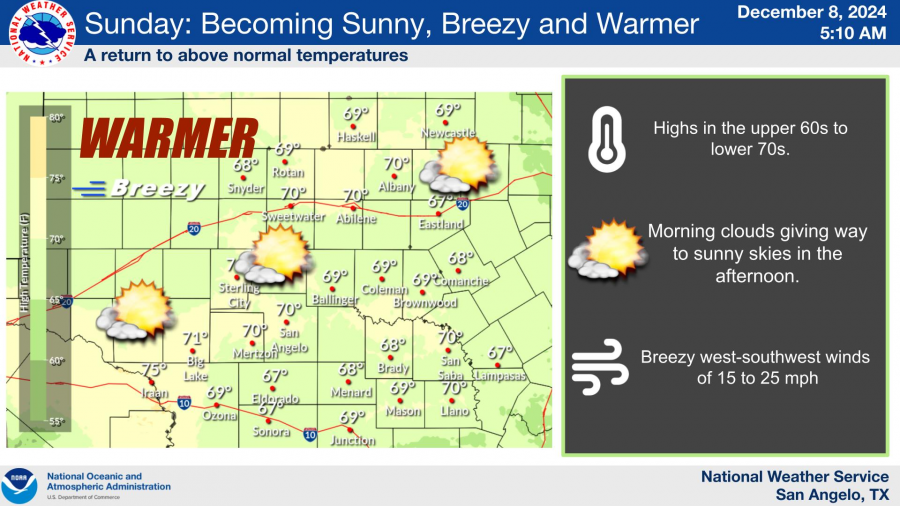Morning clouds will give way to sunshine across the area, with west-southwest winds increasing to 15 to 25 mph. Highs will reach 70 degrees in San Angelo and surrounding areas, marking a return to above-average temperatures.