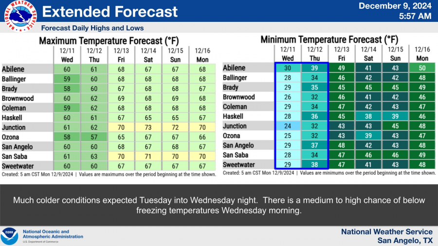 However, temperatures are expected to drop by Tuesday evening, with lows reaching 29 degrees in San Angelo. Freezing conditions are most likely early Wednesday morning.