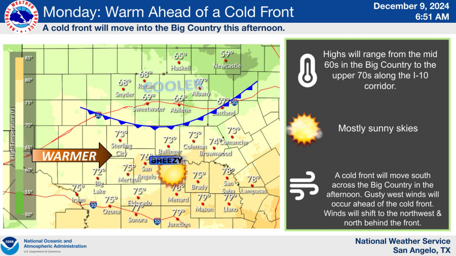 Gusty northwest winds will accompany the front as it progresses through the Big Country this afternoon. Highs in the Big Country will range from the mid-60s to the low 70s, with mostly sunny skies before the colder air sets in.