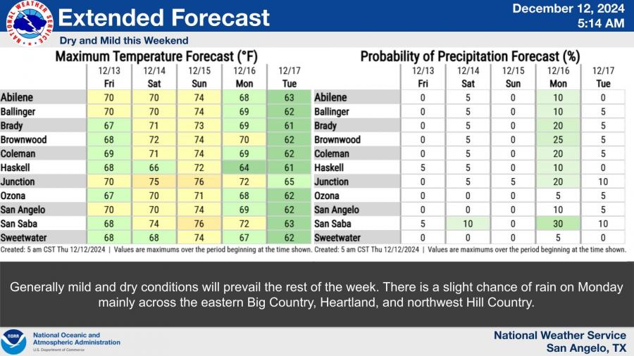 The extended forecast highlights mild and dry conditions throughout the weekend.