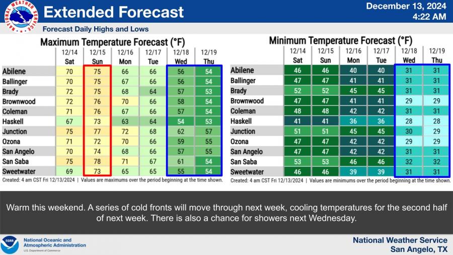 Highs are forecast to drop into the mid-50s by Wednesday and Thursday, with lows potentially falling to freezing or below for much of the area, including San Angelo.