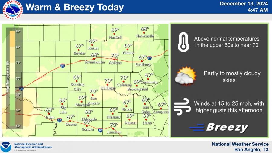 SAN ANGELO, TX - San Angelo and much of West Central Texas will enjoy above-normal temperatures today, with highs reaching the upper 60s to near 70 degrees, according to the National Weather Service.