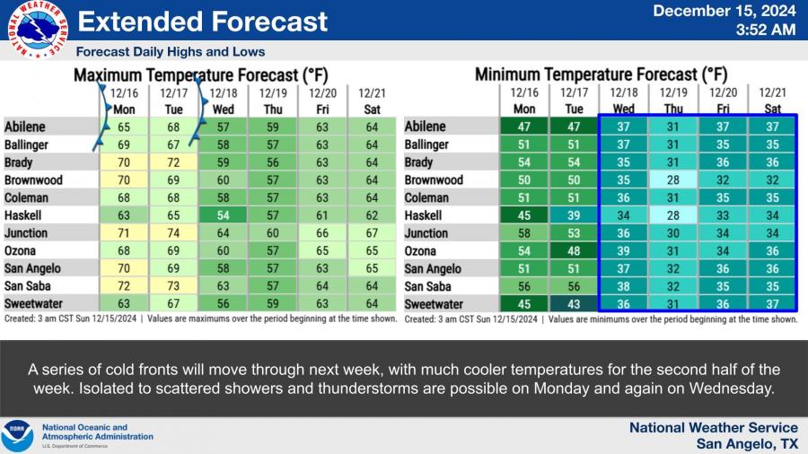 However, a series of cold fronts is set to bring a noticeable cooldown by midweek. High temperatures will fall into the 50s and 60s starting Wednesday, with lows plunging into the 30s in many areas. San Angelo is forecast to see highs of 58°F Wednesday, while overnight temperatures could dip as low as 31°F.