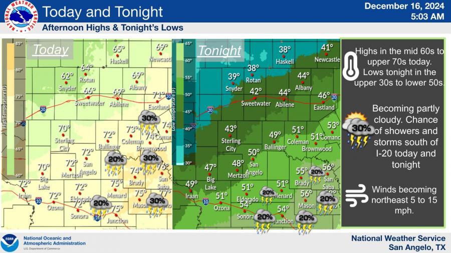 SAN ANGELO, TX — A weak cold front moving through the area Monday will drop temperatures by 8 to 10 degrees across the Big Country, bringing a slight chance of showers and thunderstorms east of the Abilene-to-Sonora line.