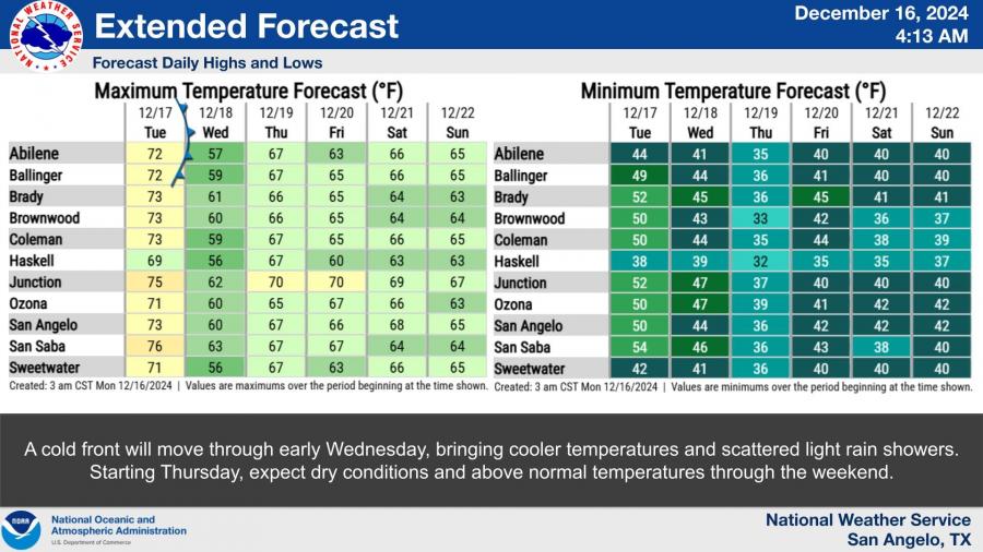 San Angelo will see a high of 72 on Monday, with temperatures dropping to 60 degrees by Wednesday and climbing back into the 60s by the weekend.