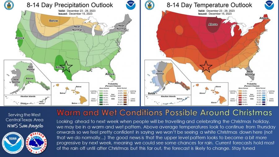 SAN ANGELO, TX — Residents in West Central Texas can expect warmer-than-average temperatures around Christmas, with rain chances likely to develop after the holiday, according to the National Weather Service (NWS) San Angelo office.