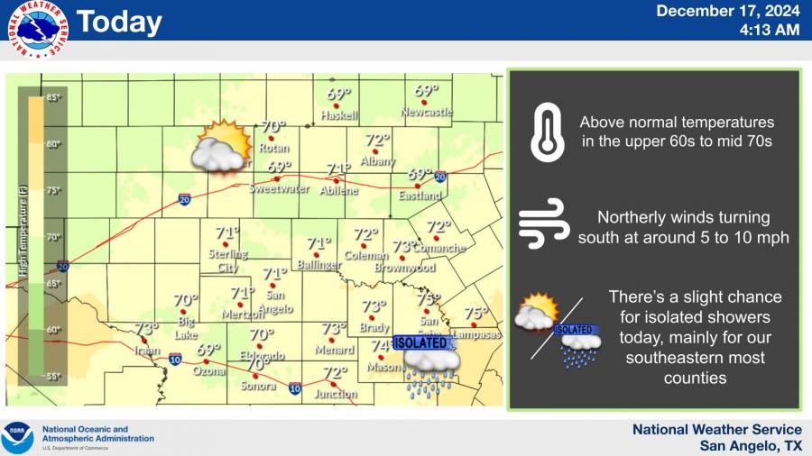 The National Weather Service reported a slight chance (15%) for isolated showers Tuesday, primarily southeast of a line from Brownwood to Sonora. Northerly winds will shift south at 5 to 10 mph by the afternoon, while temperatures will remain unseasonably warm.
