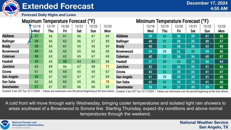 By Wednesday, the cold front will lower daytime highs to the upper 50s and low 60s, with overnight lows dropping into the 30s across much of the region. Isolated showers are likely southeast of San Angelo early Wednesday before conditions dry out.