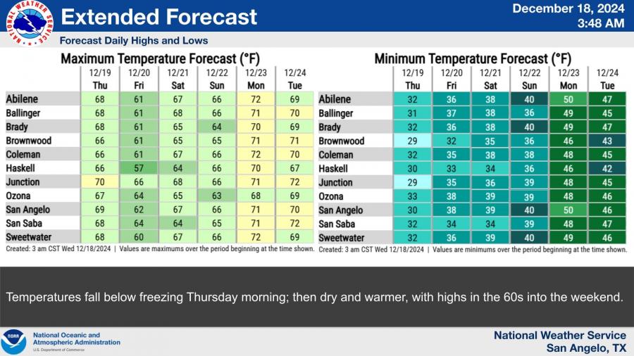 Forecast highs for San Angelo include 59 degrees Wednesday, increasing to 67 degrees by Saturday, while lows are expected to reach 30 degrees Thursday morning before gradually rising.