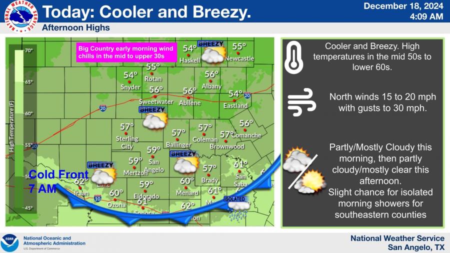 SAN ANGELO, TX – A cold front sweeping through the region Wednesday morning is bringing cooler, breezy conditions and a drop in temperatures, according to the National Weather Service in San Angelo.