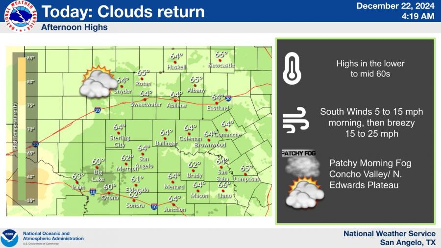 The NWS warns that the patchy morning fog could impact visibility in areas south of Ozona and Sonora. This is part of a weather pattern that will see mostly cloudy skies on Monday before transitioning to sunnier conditions later in the week.