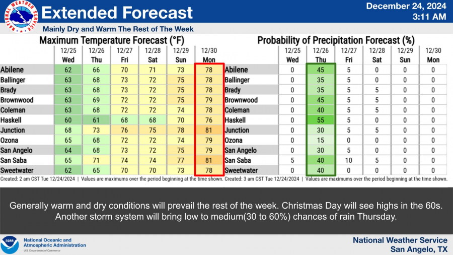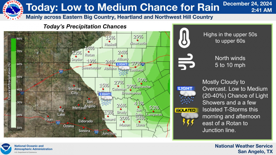 The National Weather Service in San Angelo reports a 20% to 40% chance of light showers and storms primarily affecting the eastern Big Country, Heartland, and Northwest Hill Country.