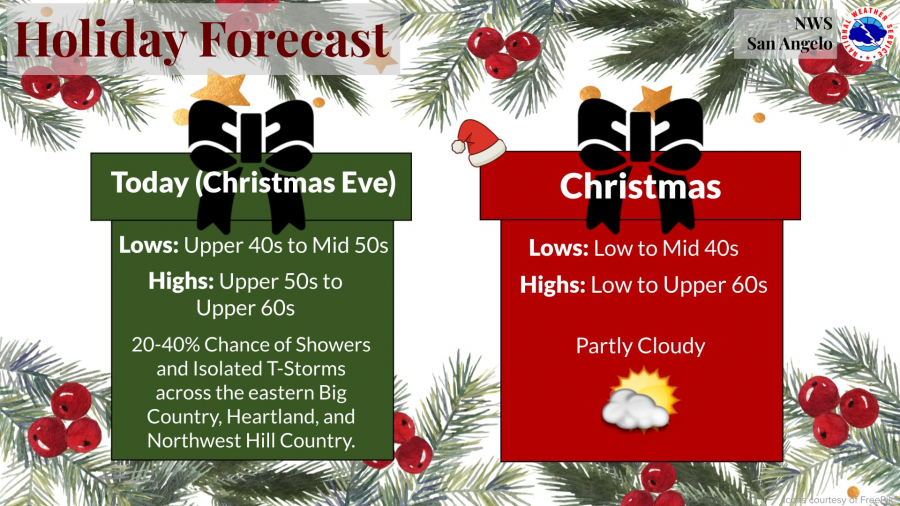 For Christmas Day, conditions are forecast to improve with partly cloudy skies and dry weather. Temperatures will remain mild, with highs ranging from the low to upper 60s and lows in the low to mid-40s.