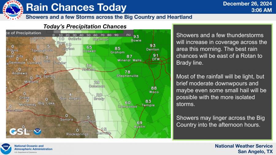 SAN ANGELO, TX — Showers and thunderstorms are expected to expand across the Big Country and Heartland today, with precipitation chances highest east of a Rotan-to-Brady line, according to the National Weather Service in San Angelo.