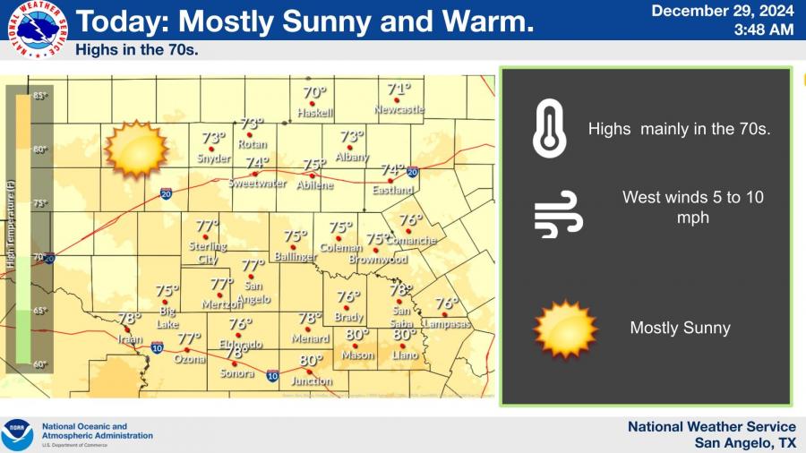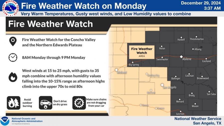 SAN ANGELO, TX – The National Weather Service has issued a Fire Weather Watch for the Concho Valley and Northern Edwards Plateau on Monday, Dec. 30, due to the combination of warm temperatures, gusty winds, and low humidity. The watch is in effect from 8 a.m. to 9 p.m.