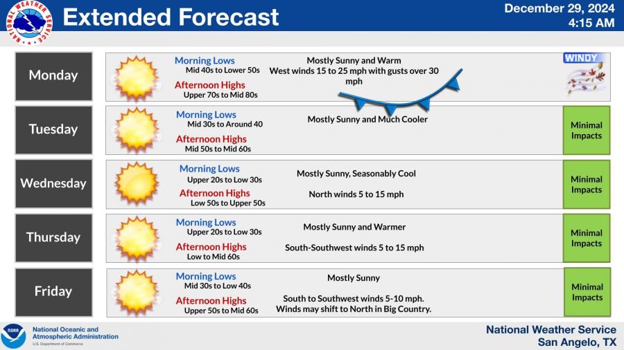 The extended forecast predicts cooler temperatures starting Tuesday as a cold front moves through the area. Highs will fall to the mid-50s to mid-60s, with morning lows in the 30s. Seasonably cool conditions will persist through midweek, accompanied by sunny skies and lighter winds.
