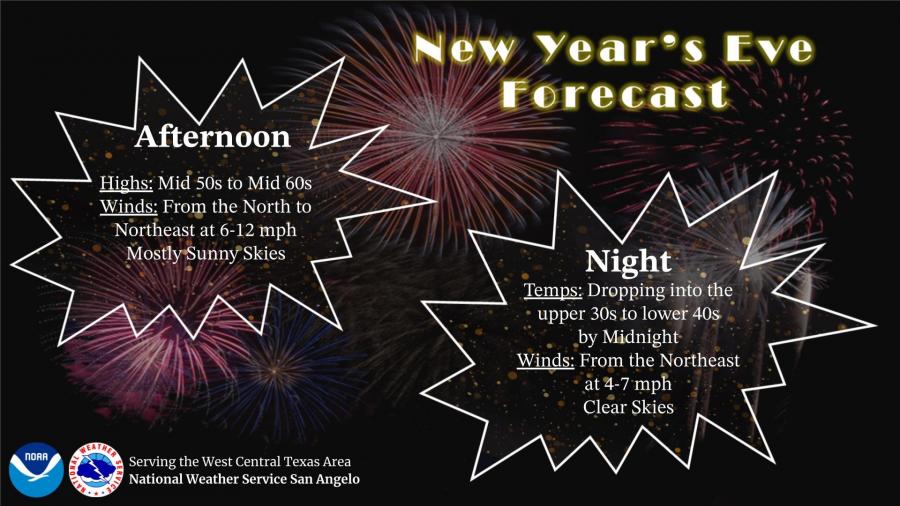 Conditions will cool slightly on New Year’s Eve, with afternoon highs ranging from the mid-50s to mid-60s under mostly sunny skies. Winds from the north to northeast are expected at 6-12 mph. By midnight, temperatures will dip into the upper 30s to lower 40s with light northeast winds at 4-7 mph and clear skies.