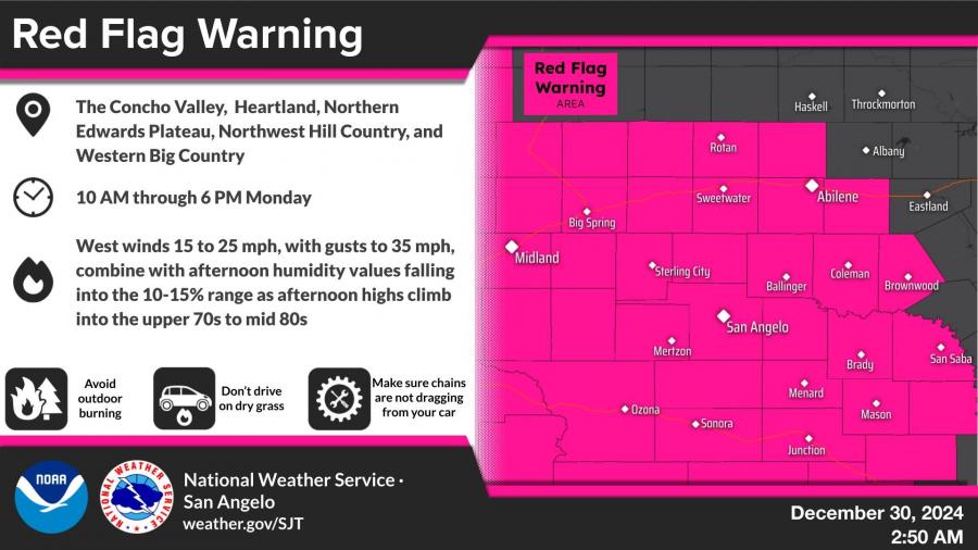 SAN ANGELO, TX - The National Weather Service in San Angelo has issued a Red Flag Warning for Monday, from 10 a.m. to 6 p.m., citing critical fire weather conditions due to gusty winds, low humidity, and warm temperatures.