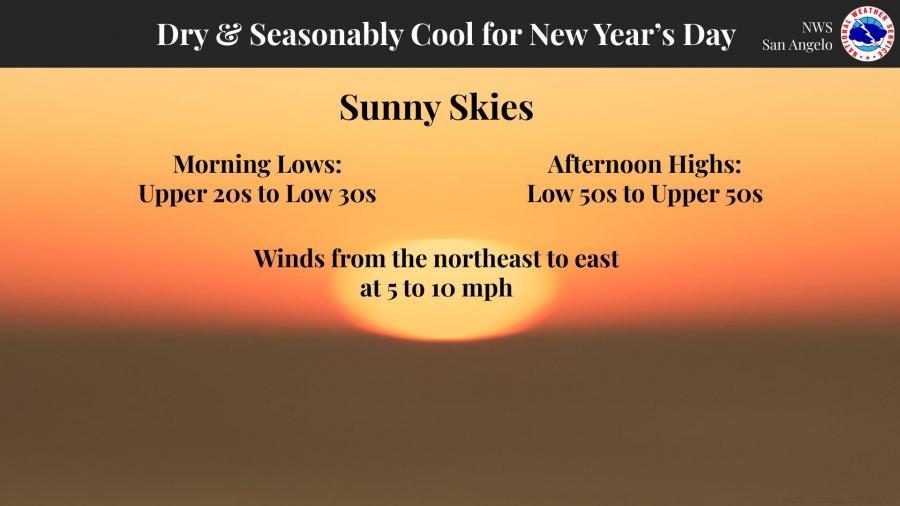 On New Year’s Day, the region will experience dry, sunny weather with morning lows in the upper 20s to lower 30s and afternoon highs in the low to upper 50s. Winds will shift from the northeast to the east at 5-10 mph.
