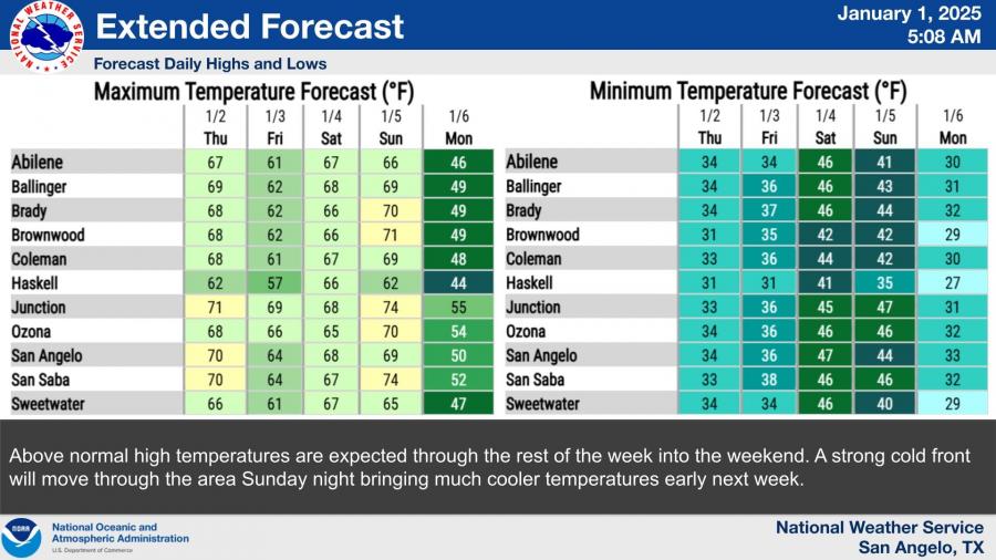 Above-normal high temperatures are forecast to continue through the rest of the week. San Angelo can expect daytime highs to climb into the upper 60s and low 70s by the weekend.