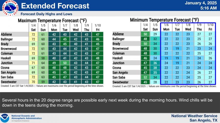 SAN ANGELO, TX - San Angelo and the surrounding West Central Texas region will see a sharp drop in temperatures early next week as a strong cold front moves in, bringing dangerously cold conditions and wind chills in the teens.