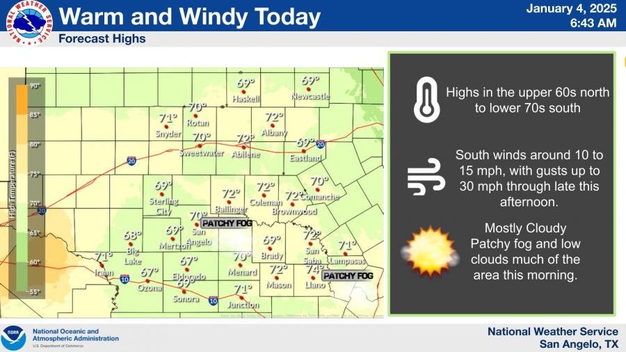 Saturday’s forecast calls for highs in the upper 60s to lower 70s with south winds of 10-15 mph, gusting up to 30 mph. Patchy fog and low clouds may linger through the morning hours, according to the National Weather Service in San Angelo.