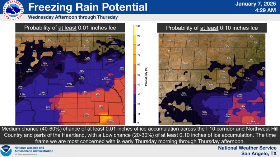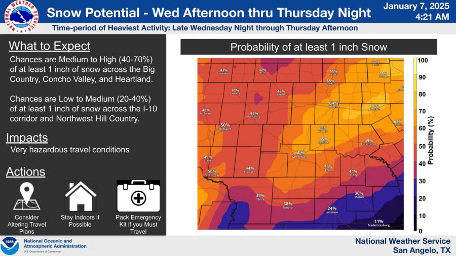 SAN ANGELO, TX – Freezing rain, ice accumulation, and snowfall are expected to create hazardous travel conditions across West Central Texas starting Wednesday afternoon through Thursday, according to the National Weather Service in San Angelo.
