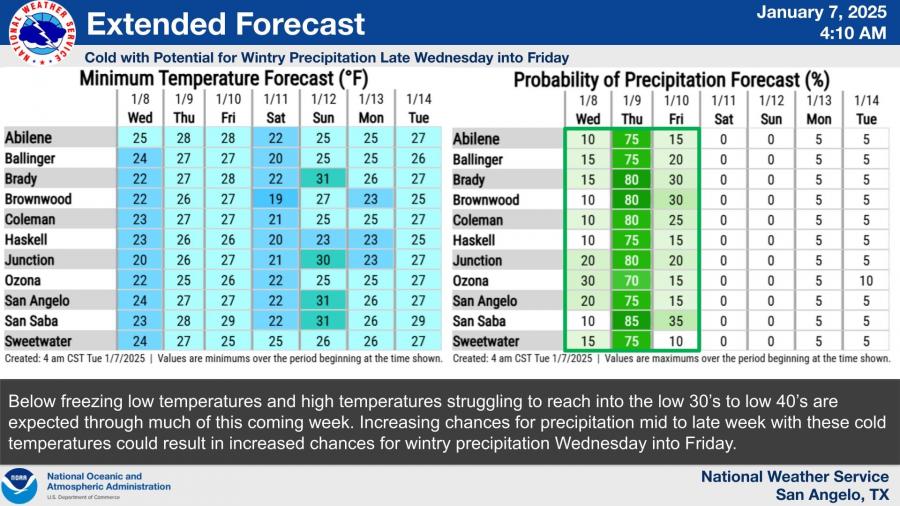The extended forecast shows increasing chances for wintry precipitation mid-to-late week, with significant snowfall possible. There is a medium to high chance (40-70%) of at least 1 inch of snow across the Big Country, Concho Valley, and Heartland. Northwest Hill Country and areas along the I-10 corridor face a lower chance (20-40%) of the same snowfall totals.