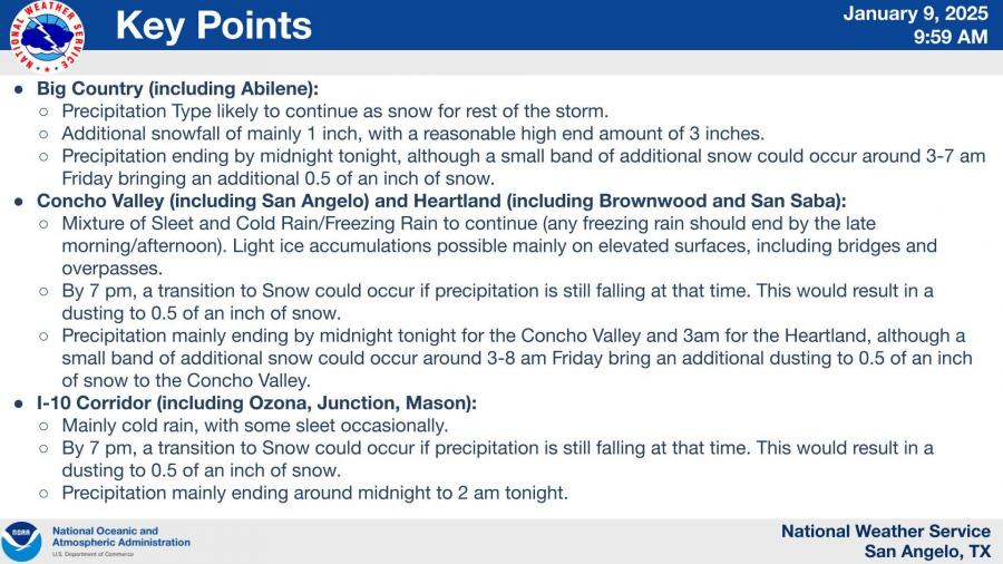 • Big Country (including Abilene): Snowfall is expected to continue, with accumulations ranging from 1 inch to a possible 3 inches. Precipitation should end by midnight.
