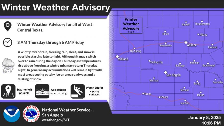 SAN ANGELO, TX — Freezing rain and sleet are expected to persist in the Concho Valley, including San Angelo, through late Thursday morning and early afternoon as a Winter Weather Advisory remains in effect until 6 a.m. Friday.
