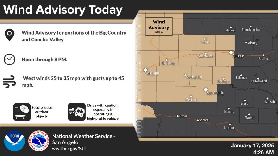 SAN ANGELO, TX – The National Weather Service in San Angelo has issued a Wind Advisory for portions of the Concho Valley and Big Country, effective from noon to 8 p.m. today.