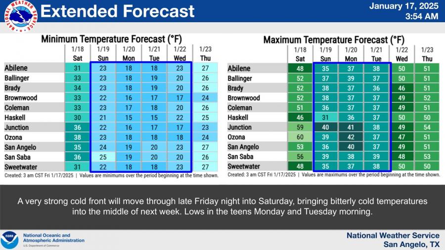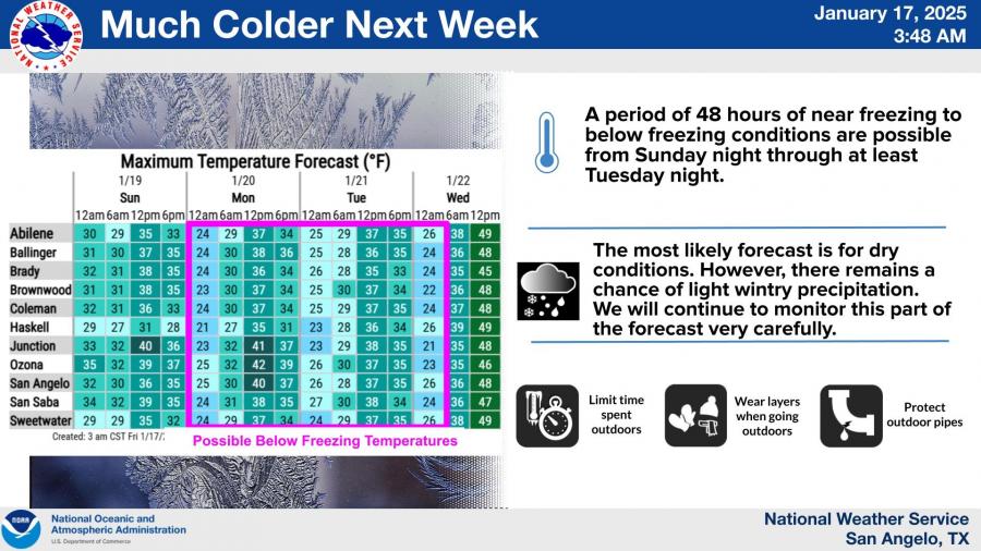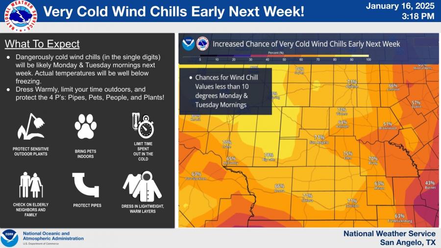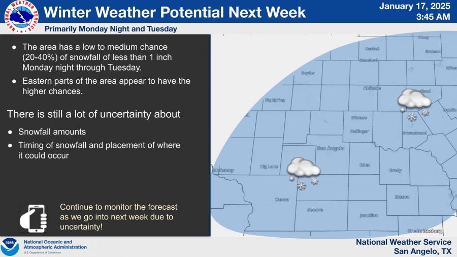 There is a 20-40% chance of light snowfall Monday night into Tuesday, primarily in eastern areas of the Concho Valley. Snow accumulations are expected to remain below 1 inch, but uncertainty remains about the timing and specific locations of precipitation.