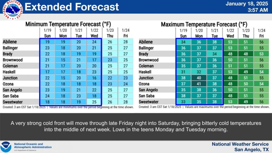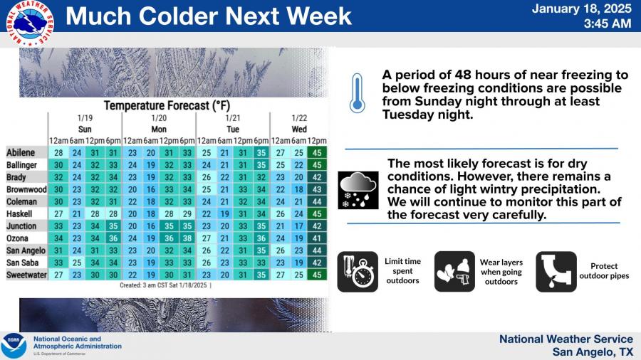 Subfreezing temperatures are forecast to persist from Sunday evening through midday Wednesday across much of the region. Lows will drop into the teens on Monday and Tuesday mornings, with San Angelo expected to reach 19°F on Monday. Wind chills could fall below 10°F during this period, creating dangerously cold conditions.